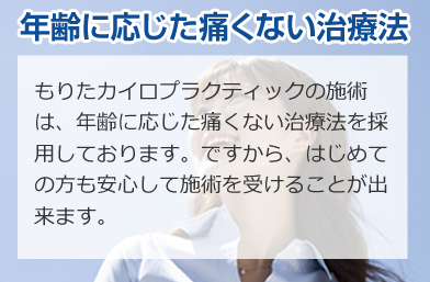 もりたカイロプラクティックでは、施術される方の痛みをしっかりと伺い、原因が何かを考えた上で、施術を行わせていただきます。